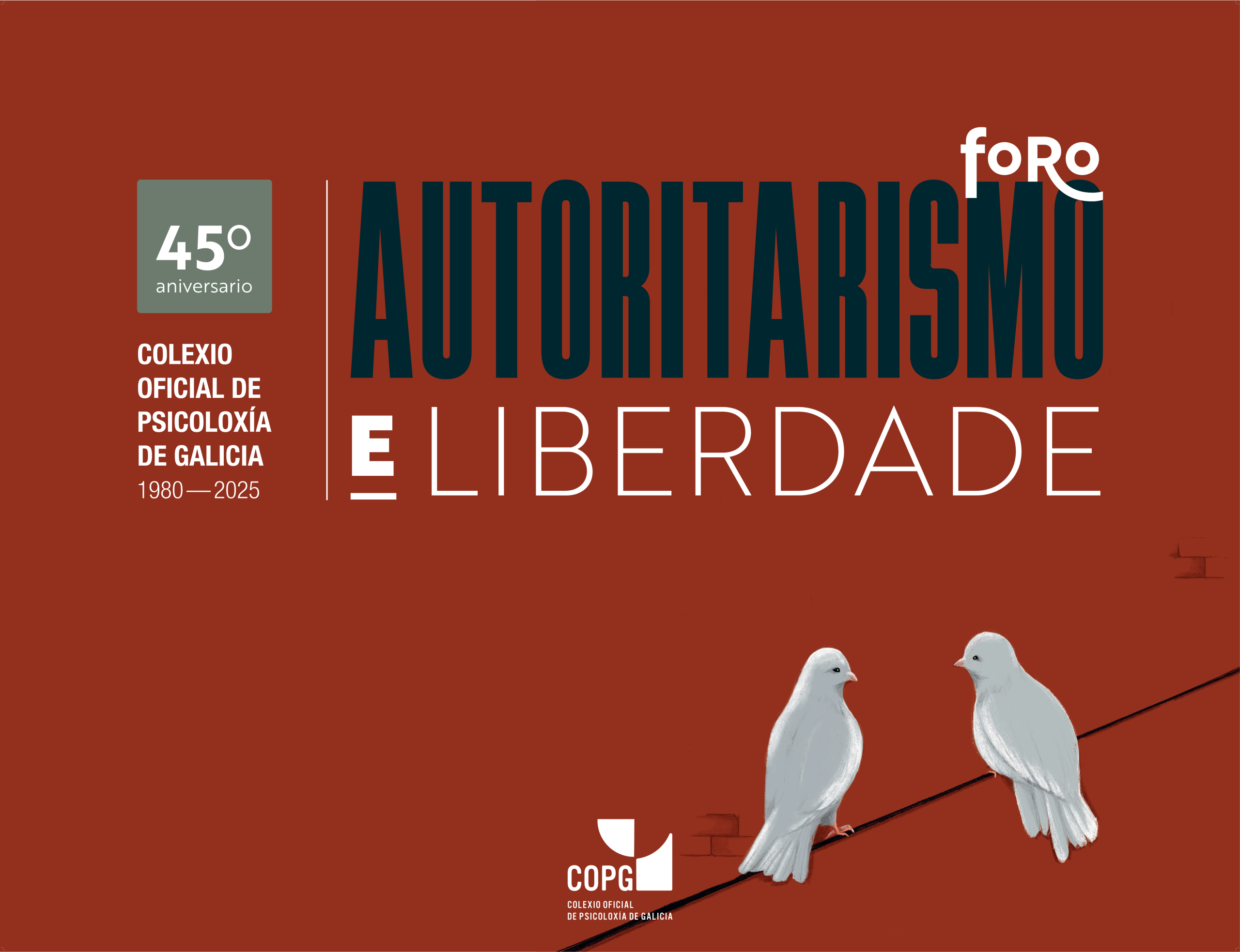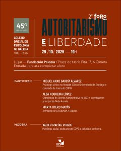 Dentro das actividades do noso colexio profesional, prevalece a reivindicación do dereito á accesibilidade á atención psicolóxica e, dun xeito máis xeral, a defensa dos dereitos humanos como un factor imprescindible para a protección da saúde mental. Neste senso, e no marco do 45 aniversario da nosa institución, o COPG impulsa uns foros que sirvan de espazo de debate e reflexión sobre a actual deriva da nosa sociedade, que demos en nomear «Autoritarismo e Liberdade».