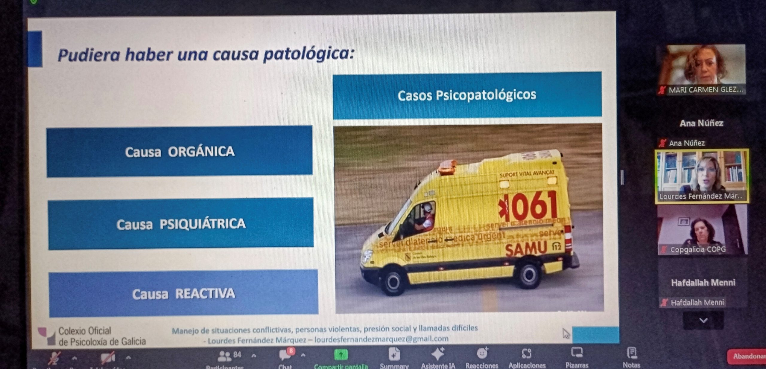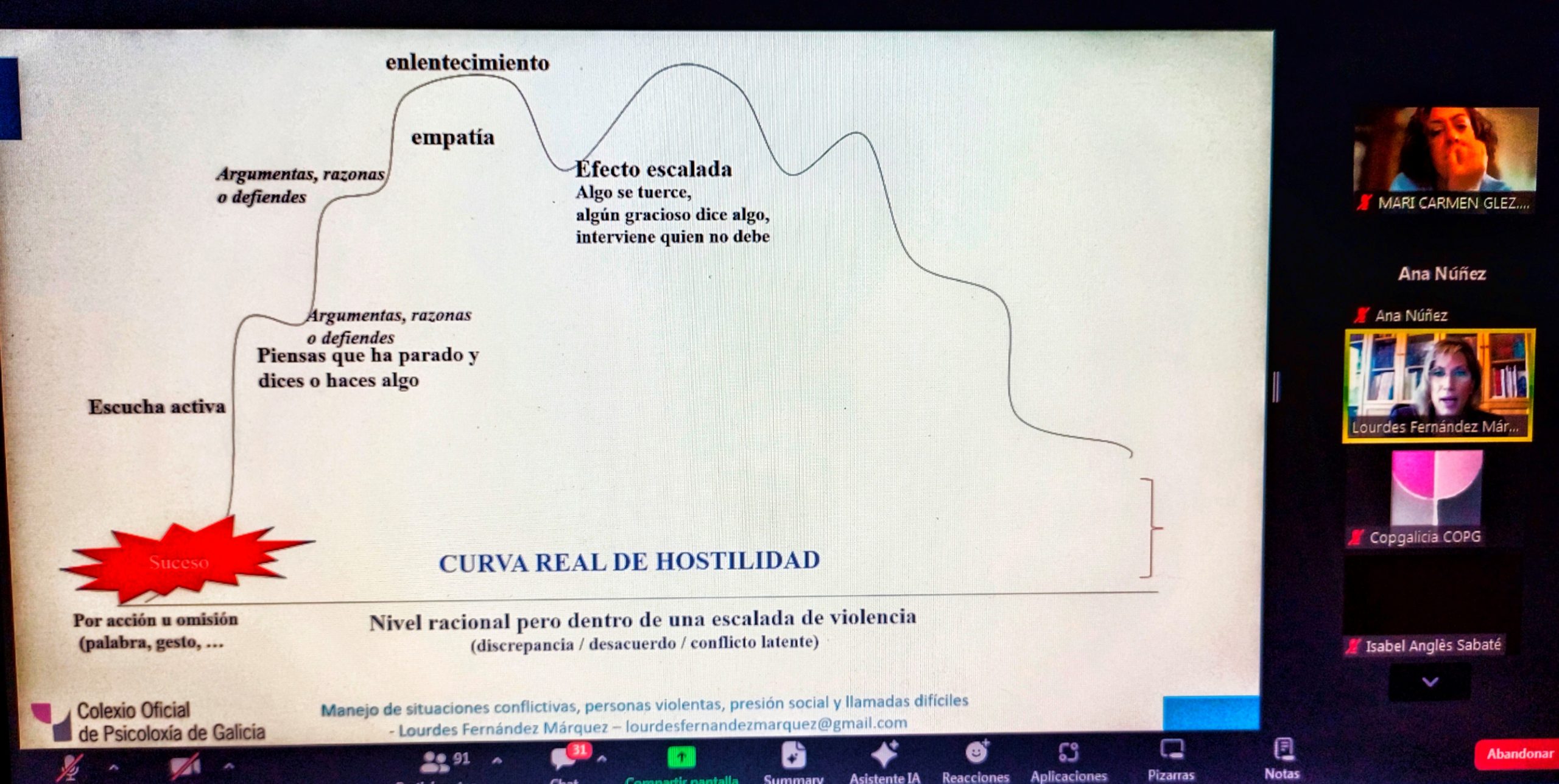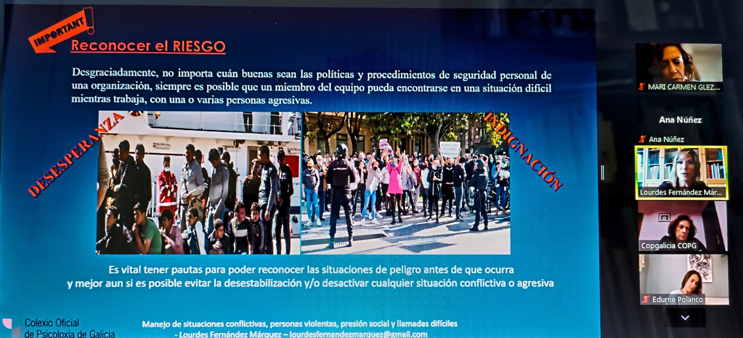 Lourdes Fernández Márquez foi a docente deste curso que se celebrou a través da plataforma Moodle do COPG o día 4 de novembro de 2023 e que contou con 96 inscritos. Durante as cinco horas de duración da formación, a docente achegou aos asistentes o concepto de conflito; mostrou como recoñecer escenarios difíciles con risco de conflito ou violencia; ofreceu pautas para previr a aparición de complicacións violentas durante a intervención; incidiu nas habilidades de comunicación ante persoas frustradas, enfadadas ou violentas, ou con desordes conductuais; mostrou como recoñecer e manexar as nosas propias reaccións como intervenientes fronte á frustración e o conflito, e resaltou a importancia do autocoidado dos intervenientes.