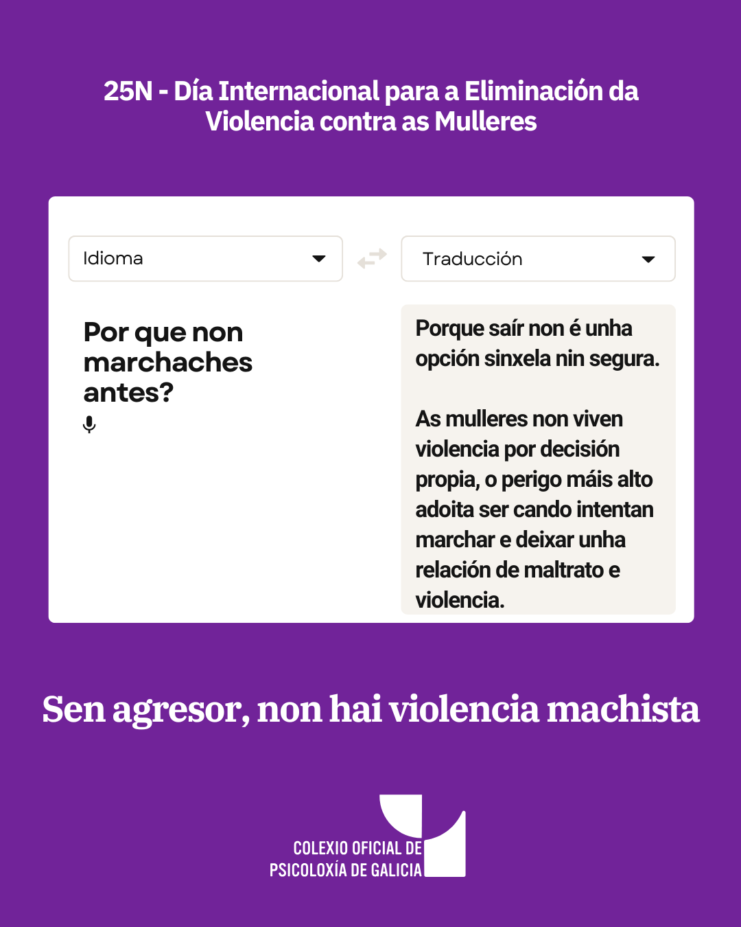 O Día Internacional da Eliminación da Violencia Contra as Mujeres lémbranos que aínda queda moito por facer. Desde o Colexio Oficial de Psicoloxía de Galicia e o Consejo General de la Psicología, reafirmamos o noso compromiso de traballar por unha sociedade libre de violencias, na que as mulleres poidan vivir con dignidade, respecto e en igualdade de condicións. É hora de alzar a voz e actuar contra todas as formas de violencia, simbólica e doutro tipo, que afectan as mulleres. Como sociedade, podemos construír un futuro máis xusto e igualitario.